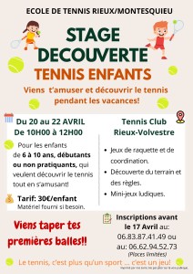 École de tennis Rieux/Montesquieu : Stage découverte tennis du 20 au 22 avril de 10h à 12h au tennis club de Rieux-Volvestre.