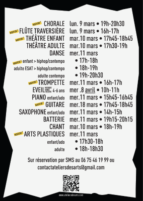 Sur réservations : 06 75 46 19 99 ou contactateliersdesarts @ gmail.com