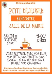 Le Petit déjeuner "Rencontre" aura lieu samedi 11 octobre à la salle de la Mairie à partir de 9h.