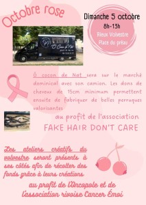 "Ô cocon de Nat" sera au marché dominical : dimanche 5 octobre de 8h à 13h, au profit de l'association "Fair hair don't care" pour une collecte de cheveux. Nous récoltons des dons de cheveux afin de réaliser des perruques de qualité et à moindre coût, afin d'aider les personnes atteintes de cancer.