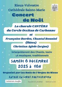 Les "Amis de l'Orgue" vous invitent au traditionnel concert de Noël à la cathédrale Sainte-Marie de Rieux-Volvestre : Samedi 6 décembre à 16h00.