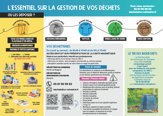 "Les calendriers de collecte des déchets pour l’année 2026 sont désormais disponibles sur le site internet de la Communauté des Communes du Volvestre. Un calendrier “tout-en-un”, simple et pratique, est proposé pour chaque commune (ou par secteurs pour certaines), afin de vous accompagner tout au long de l’année.